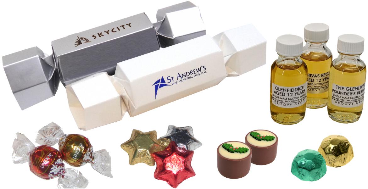 Choose from a range of fillings such as Lindt Lindor, Xmas Puddings, solid chocolate Hearts, Stars, Bells, Diamonds or Baubles, or suggest your own choice of confectionary - just ask! For something extra special, choose our selection of whisky miniatures or other spirits. You can also supply own confectionary or gifts, we'll do the rest!